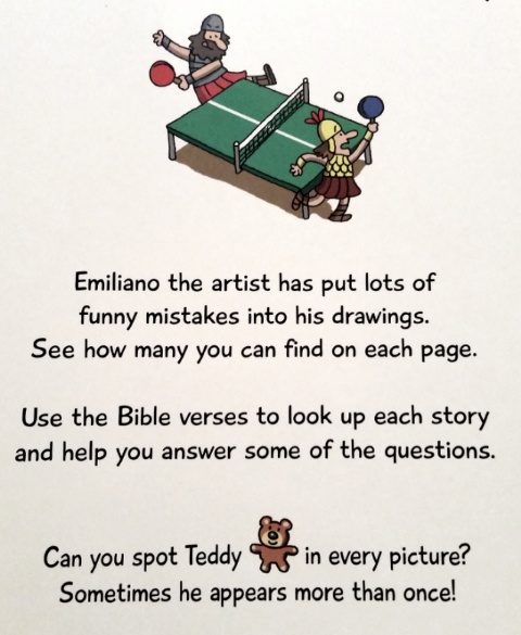 Eight Bible stories are depicted in bright color and comic, cartoony illustrations. There is a sentence or two explaining the scene at the top, and then details to spot, mistakes to find, and questions to answer along the sides of the picture, such as, "Did Noah's workmen REALLY have power tools?" and "How many rabbits are in the picture?" Children will love scouring the illustrations to find the answers and spot more amusing details in the busy artwork of Emiliano Migliardo.